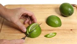 Wash the limes. Cut it as wedges. Place the lime flesh side down. Using a sharp knife, make a small lengthwise angled cut in the middle of the lime. Make another small angled cut on opposite side of the first cut to form a small wedge to be removed from the rind of the lime.
